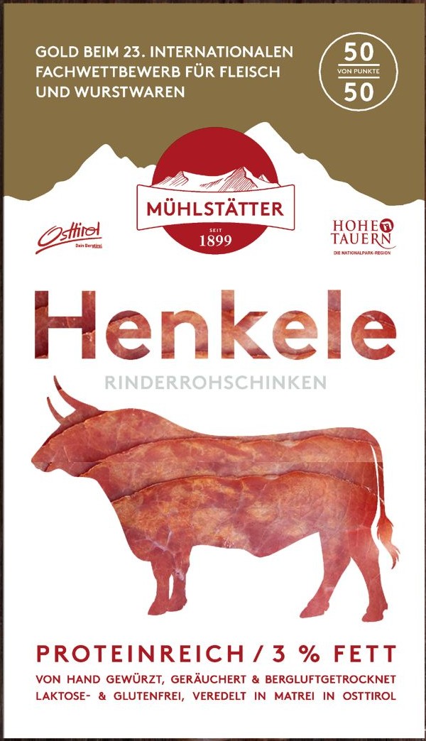 Henkele Rinderrohschinken ist die preisgekrönte Delikatesse aus dem Hause „Mühlstätter“. In dünne Scheiben aufgeschnitten und fertig zum Verzehr.